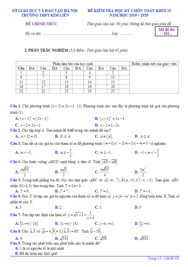 Đề kiểm tra học kỳ 1 Toán lớp 10 năm 2019 – 2020 trường THPT Kim Liên Hà NộiVào ngày … tháng 12 năm 2019, trường THPT Kim Liên – Hà Nội đã tổ chức kỳ thi kiểm tra chất lượng cuối học kỳ 1 môn Toán cho học sinh lớp 10 năm học 2019 – 2020. Đề kiểm tra có mã đề 101, bao gồm 02 bài thi:1. Bài thi trắc nghiệm: – Số câu: 25- Tổng số điểm: 5,0 điểm – Thời gian làm bài: 45 phút2. Bài thi tự luận: – Số câu: 03- Tổng số điểm: 5,0 điểm- Thời gian làm bài: 45 phút- Đề thi có lời giải chi tiếtMột số câu hỏi từ đề kiểm tra:1. Mệnh đề nào sau đây là phủ định của mệnh đề “Mọi động vật đều di chuyển”? A. Có ít nhất một động vật di chuyển. B. Có ít nhất một động vật không di chuyển. C. Mọi động vật đều không di chuyển. D. Mọi động vật đều đứng yên.2. Cho tam giác ABC. Tìm tập hợp các điểm M thỏa mãn |MB – MC| = |BM – BA|.3. Trong các phát biểu sau, phát biểu nào là mệnh đề? A. 3 là số nguyên tố lẻ nhỏ nhất. B. Đề thi hôm nay khó quá! C. Một tam giác cân thì mỗi góc đều bằng 60° phải không? D. Các em hãy cố gắng học tập!4. Cho hình chữ nhật ABCD có AD = a, AB = x. K là trung điểm của AD. a) Biểu diễn AC, BK theo AB, AD. b) Tìm x theo a để AC vuông góc BK. c) Đặt hình chữ nhật ABCD trong hệ trục tọa độ Oxy sao cho A(1;5), C(6;0). Gọi I là giao điểm của BK và AC, tìm tọa độ điểm I.5. Khi nuôi cá thí nghiệm trong hồ, một nhà khoa học đã đưa ra điều kiện số lượng cá thả để thu hoạch nhiều nhất.Đề thi mang tính chất đa dạng, giúp học sinh rèn luyện kỹ năng và kiến thức toán học. Chắc chắn rằng học sinh trường THPT Kim Liên – Hà Nội sẽ có cơ hội thể hiện khả năng và kiến thức của mình thông qua kỳ thi này.