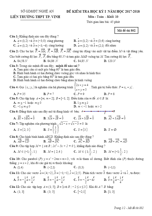 Đề kiểm tra học kì 1 (HK1) lớp 10 môn Toán năm học 2017-2018 liên trường THPT thành phố Vinh Nghệ An