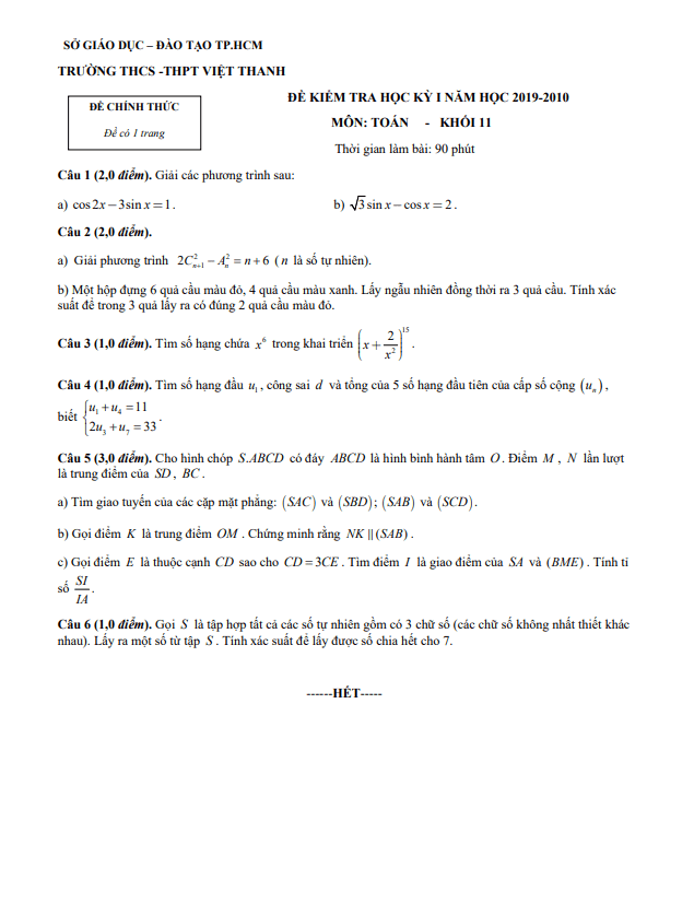 Đề kiểm tra học kỳ 1 Toán lớp 11 năm 2019 – 2020 trường Việt Thanh TP HCM