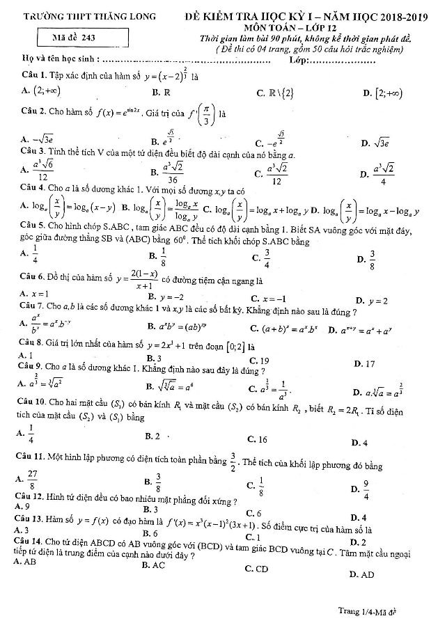 Đề kiểm tra học kỳ 1 Toán lớp 12 năm 2018-2019 trường THPT Thăng Long – Hà Nội mã đề 243 là một bộ đề gồm 50 câu hỏi và bài toán được biên soạn theo hình thức trắc nghiệm khách quan. Học sinh có thời gian 90 phút để hoàn thành bài thi, kỳ thi được tổ chức vào ngày 12/12/2018 tại trường. Đề thi được đánh số với các mã đề 141, 243, 345, 456.