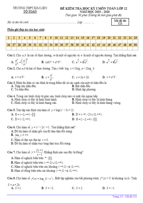 Đề kiểm tra học kỳ 1 Toán lớp 12 trường THPT Kim Liên Hà Nội