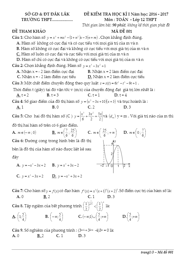 Đề kiểm tra học kì 1 (HK1) lớp 12 môn Toán năm học 2016 2017 sở GD và ĐT Đăk Lăk (Đề tham khảo)