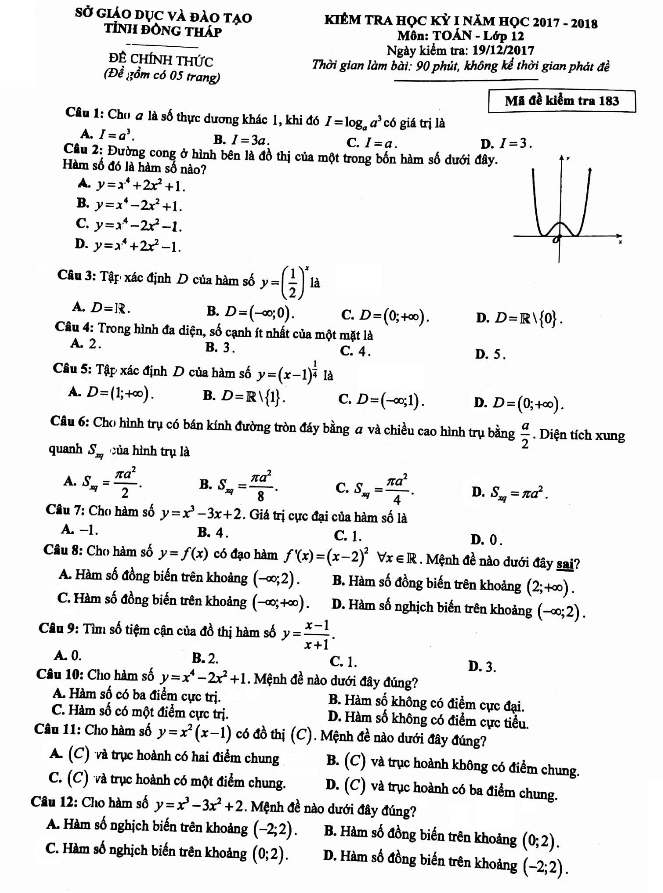 Đề kiểm tra học kỳ 1 Toán lớp 12 năm học 2017 – 2018 sở GD và ĐT Đồng Tháp
