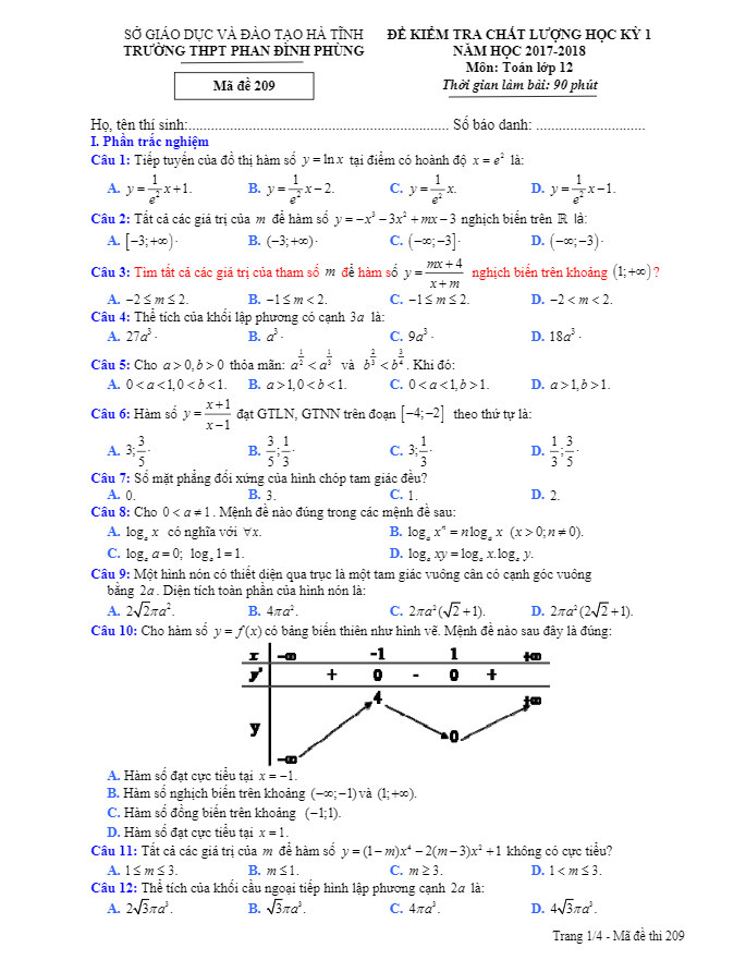 Tiêu đề: Đề kiểm tra học kỳ 1 Toán lớp 12 năm học 2017-2018 trường THPT Phan Đình Phùng Hà TĩnhNội dung:Trong đề kiểm tra học kỳ 1 môn Toán lớp 12 năm học 2017-2018 của trường THPT Phan Đình Phùng Hà Tĩnh, có tổng cộng 45 câu hỏi trắc nghiệm và 2 bài toán tự luận trải đều trên 4 trang. Thời gian làm bài được dành cho học sinh là 90 phút.Đề thi nhằm mục đích kiểm tra chất lượng học tập của học sinh khối 12 trong giai đoạn học kỳ 1. Đề thi được ra bởi ban giáo vụ nhà trường, đã được chấm điểm và có đáp án cũng như lời giải chi tiết để học sinh tự kiểm tra và tự chỉnh sửa bài làm của mình.Một số câu hỏi trong đề kiểm tra bao gồm:1. Cho hình chóp S.ABCD có đáy ABCD là hình vuông cạnh 2a√2, mặt phẳng (α) qua A vuông góc với SC và cắt SB, SC, SD tại M, N, P. Thể tích của khối cầu ngoại tiếp hình chóp CMNP là bao nhiêu?2. Nếu bạn gửi vào ngân hàng 15,625 triệu đồng và rút được cả vốn lẫn lãi là 19,683 triệu đồng sau ba năm theo phương thức lãi kép, thì lãi suất tiết kiệm hàng năm là bao nhiêu?3. Xét hàm số y = f(x) = -x^3 + x^2 – 3x – 1, khẳng định nào sau đây là đúng:A. Đồ thị hàm số y = f(x) cắt trục hoành tại ba điểm phân biệt.B. Đồ thị hàm số y = f(x) không cắt trục hoành.C. Đồ thị hàm số y = f(x) cắt trục hoành tại hai điểm phân biệt.D. Đồ thị hàm số y = f(x) cắt trục hoành tại một điểm.Học sinh có thể tải file WORD của đề thi để tự ôn tập và kiểm tra kiến thức của mình tại đây.