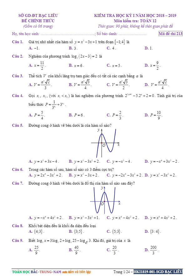 Đề kiểm tra học kỳ 1 môn Toán lớp 12 năm học 2018 – 2019 của sở GD và ĐT Bạc Liêu có mã đề 213 với tổng cộng 50 câu hỏi và bài toán trắc nghiệm khách quan. Đề bài yêu cầu học sinh hoàn thành trong thời gian 90 phút. Kỳ thi được tổ chức vào sáng ngày 28 tháng 11 năm 2018 nhằm đánh giá kết quả học tập môn Toán của học sinh khối 12 trên toàn tỉnh Bạc Liêu trong học kỳ 1.