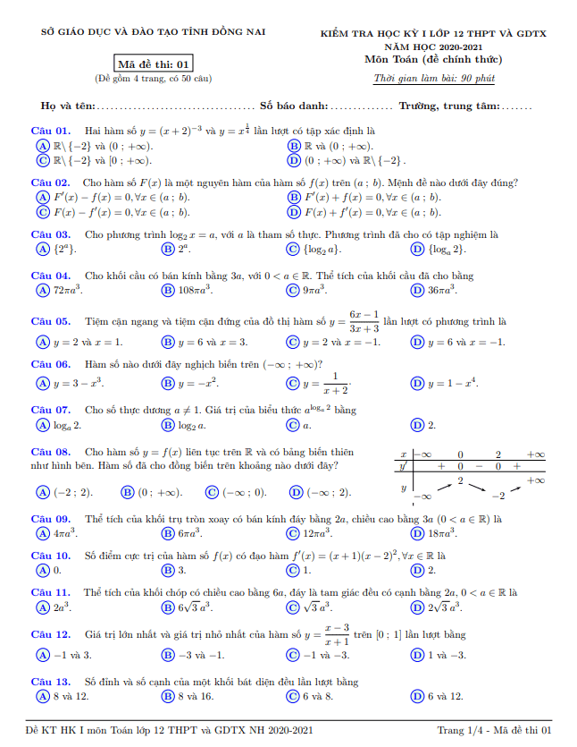 Đề kiểm tra học kỳ 1 Toán lớp 12 năm học 2020 – 2021 sở GD&ĐT Đồng Nai gồm 04 trang với 50 câu hỏi và bài toán dạng trắc nghiệm. Thời gian làm bài thi là 90 phút, đề thi có đáp án và lời giải chi tiết mã đề 01.