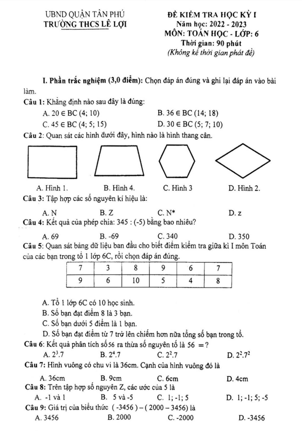 Xin gửi đến quý thầy cô và các em học sinh lớp 6 đề kiểm tra cuối học kỳ 1 môn Toán lớp 6 năm học 2022 – 2023 tại trường THCS Lê Lợi, quận Tân Phú, TP Hồ Chí Minh.