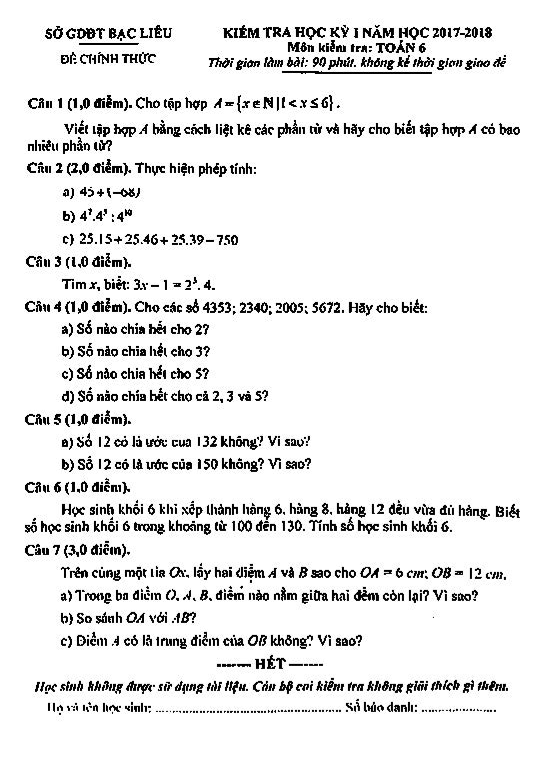 Đề kiểm tra học kì 1 môn Toán lớp 6 năm học 2017 – 2018 do sở GD và ĐT Bạc Liêu ra, bao gồm 1 trang với 7 bài toán tự luận. Thời gian làm bài là 90 phút.