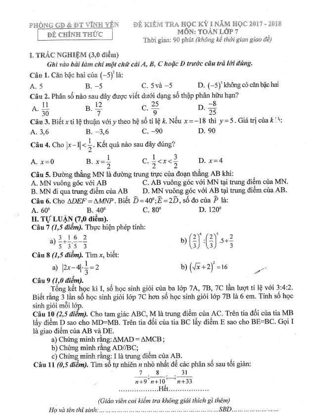 Đề kiểm tra học kì 1 (HK1) lớp 7 môn Toán năm 2017 2018 phòng GD ĐT Vĩnh Yên Vĩnh Phúc