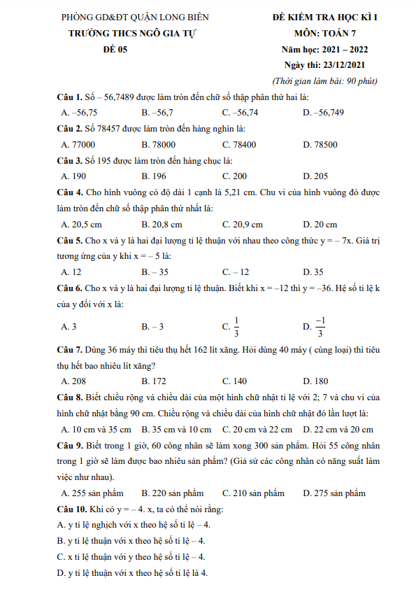 Ngày 23 tháng 12 năm 2021, trường THCS Ngô Gia Tự, quận Long Biên, thành phố Hà Nội đã tổ chức kì thi khảo sát chất lượng cuối học kì 1 môn Toán lớp 7 năm học 2021 – 2022. Đề kiểm tra học kì 1 Toán lớp 7 năm 2021 – 2022 trường THCS Ngô Gia Tự – Hà Nội được biên soạn theo hình thức đề thi 100% trắc nghiệm, gồm 40 câu hỏi và bài toán trải đều trên 05 trang giấy. Thời gian làm bài thi là 90 phút và đề thi có đáp án cho học sinh tham khảo.