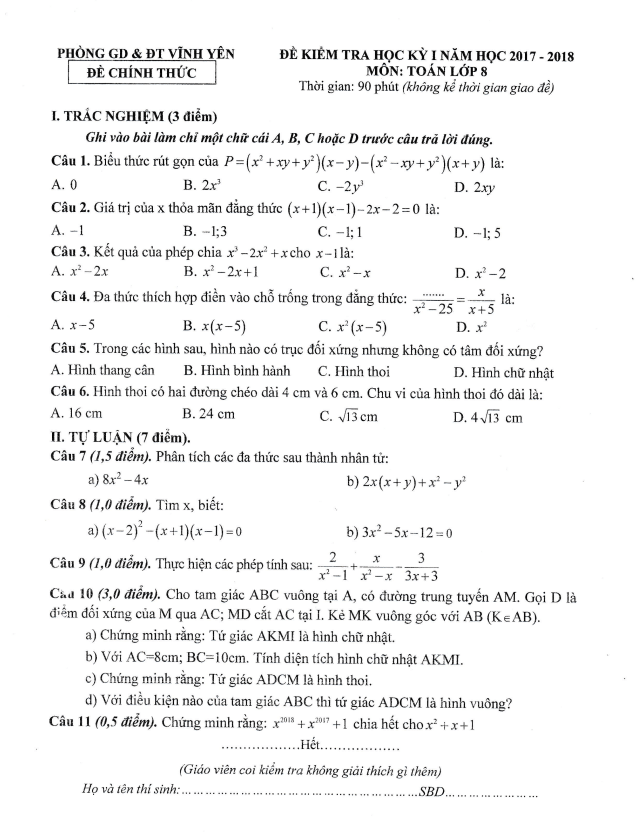 Đề kiểm tra học kì 1 Toán lớp 8 năm 2017 – 2018 phòng GD&ĐT Vĩnh Yên – Vĩnh Phúc