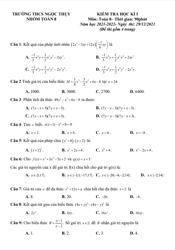 Đề kiểm tra học kì 1 (HK1) lớp 8 môn Toán năm 2021 – 2022 trường THCS Ngọc Thụy Hà NộiVào ngày 29 tháng 12 năm 2021, trường THCS Ngọc Thụy tại quận Long Biên, Hà Nội đã tổ chức kì thi khảo sát chất lượng cuối học kì 1 môn Toán cho học sinh lớp 8 năm học 2021 – 2022. Đề kiểm tra học kì 1 môn Toán cho lớp 8 năm 2021 – 2022 tại trường THCS Ngọc Thụy đã được biên soạn với hình thức đề thi 100% trắc nghiệm. Đề thi bao gồm 05 trang với 40 câu hỏi và bài toán, thời gian làm bài là 90 phút và có đáp án đi kèm.I. MỤC TIÊU– Học sinh nắm chắc quy tắc nhân, chia đơn thức, đa thức với đa thức, bảy hằng đẳng thức, cũng như các phương pháp phân tích đa thức thành nhân tử.- Vận dụng kiến thức đã học để giải các bài toán, tìm x, rút gọn biểu thức, phân tích đa thức thành nhân tử.- Quy đồng và rút gọn các phân thức, thực hiện phép công trừ hai phân thức.- Nắm vững định nghĩa và tính chất dấu hiệu nhận biết của các hình học, rèn khả năng chứng minh và suy luận hình học.- Biết tính diện tích của một số hình đã học.II. MA TRẬN|———————–|——————|——————|——————|——————|| Nội dung | Nhận biết | Thông hiểu | Vận dụng | Tổng ||———————–|——————|——————|——————|——————|| Nhân chia đơn, đa thức| 8 | 2 | 7 | 17 || Phân thức đại số | 2 | 0.5 | 5 | 7.5 || Tứ giác | 4 | 1 | 3 | 8 || Đa giác, diện tích | 2 | 0.5 | 1 | 3.5 ||———————–|——————|——————|——————|——————|| Tổng | 16 | 4 | 16 | 36.5 |Người ra đề: Hoàng Thị Thu; Tổ trưởng: Đào Lệ Hà; BGH: Đặng Sỹ Đức.Thông tin trên giúp học sinh có cái nhìn tổng quan về nội dung và mục tiêu của đề kiểm tra học kì 1 môn Toán lớp 8 năm học 2021 – 2022 tại trường THCS Ngọc Thụy Hà Nội.