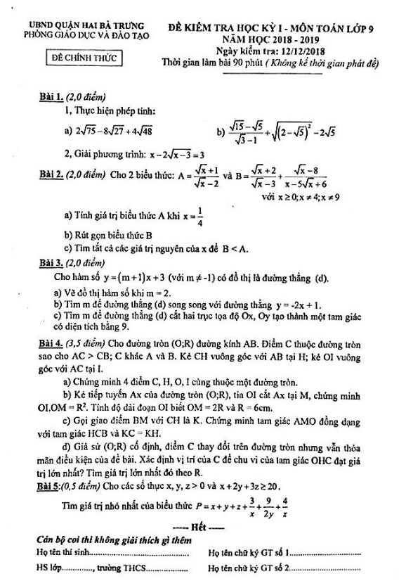 Ngày 12 tháng 12 năm 2018, kỳ kiểm tra học kỳ 1 môn Toán lớp 9 tại phòng GD&ĐT Hai Bà Trưng – Hà Nội đã diễn ra. Đề thi bao gồm 1 trang với 5 bài toán tự luận, thời gian làm bài là 90 phút. Đặc biệt, đề thi cung cấp lời giải chi tiết để học sinh tự kiểm tra và cải thiện kỹ năng giải bài toán của mình.