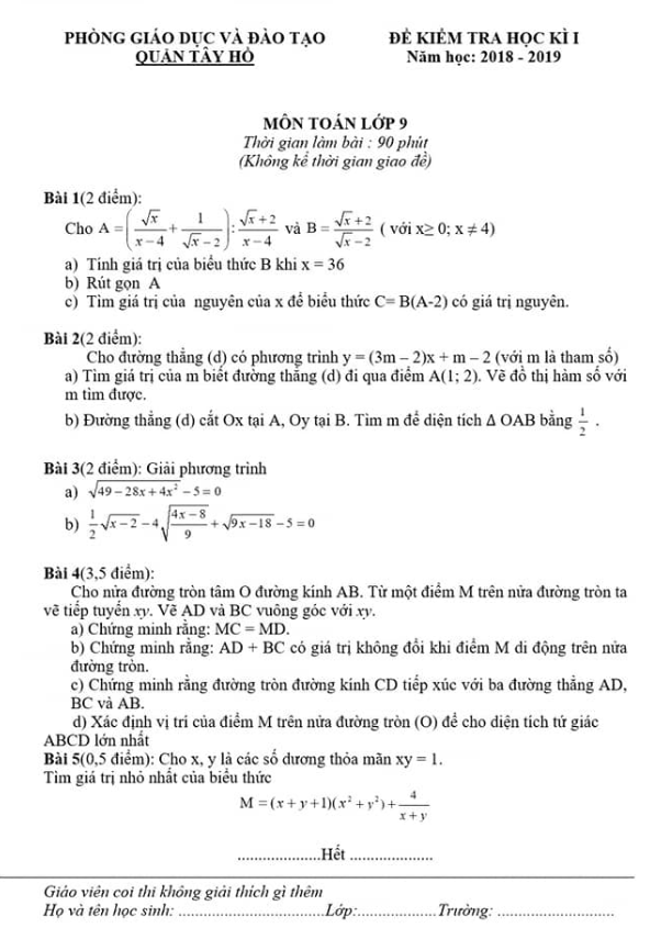 Phòng GD&ĐT Tây Hồ – Hà Nội đã biên soạn đề kiểm tra học kỳ 1 môn Toán lớp 9 năm học 2018 – 2019 nhằm đánh giá chất lượng học tập của học sinh. Đề bao gồm 5 bài toán, được thiết kế theo hình thức tự luận và thời gian làm bài là 90 phút (không tính thời gian phát đề). Kỳ thi này giúp giáo viên bộ môn Toán cũng như nhà trường đánh giá được kiến thức, kỹ năng và hiểu biết của học sinh khối lớp 9 trong suốt giai đoạn học kỳ 1 năm học vừa qua.