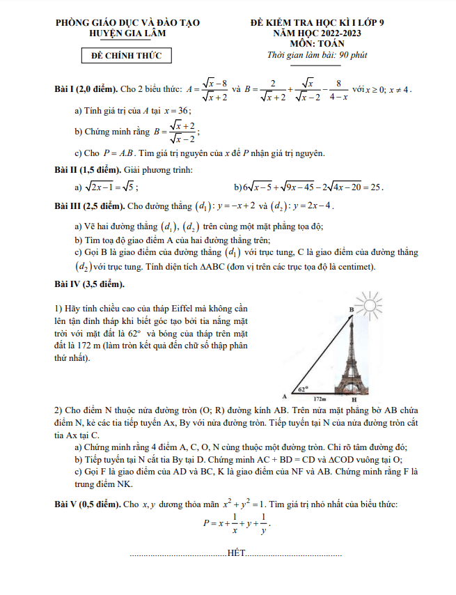 Đề kiểm tra học kì 1 (HK1) lớp 9 môn Toán năm 2022 2023 phòng GD ĐT Gia Lâm Hà Nội