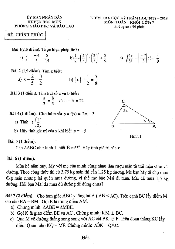 Đề kiểm tra học kỳ 1 môn Toán lớp 7 năm học 2018 – 2019 của phòng GD và ĐT Hóc Môn – TP. HCM bao gồm 1 trang với 7 bài toán tự luận. Thời gian làm bài là 90 phút, đề thi này sẽ đánh giá kỹ năng và kiến thức của học sinh trong môn Toán.