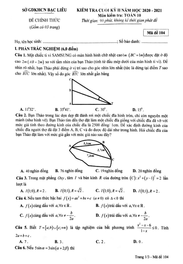 Vào ngày… tháng 05 năm 2021, sở Giáo dục, Khoa học và Công nghệ tỉnh Bạc Liêu đã tổ chức kiểm tra chất lượng môn Toán cho học sinh lớp 10 trong giai đoạn cuối của học kỳ 2 năm học 2020 – 2021. Đề kiểm tra này mang mã đề 104, bao gồm 20 câu trắc nghiệm và 04 câu tự luận, được cung cấp trên 03 trang đề thi và thời gian làm bài là 90 phút.
