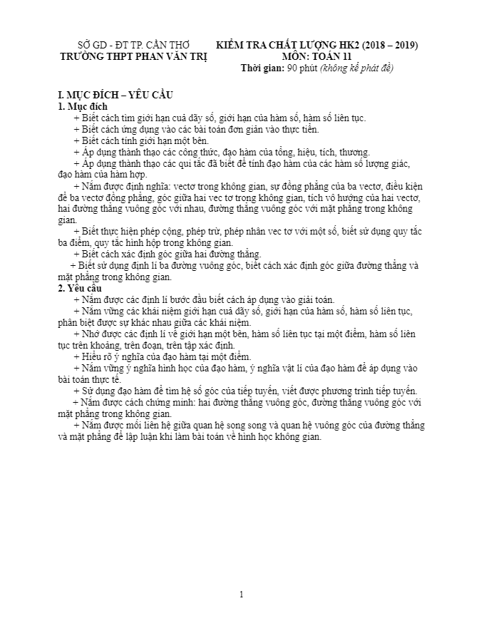 Trên đây là một số thông tin và yêu cầu của Đề kiểm tra HK2 Toán lớp 11 năm 2018 – 2019 trường Phan Văn Trị – Cần Thơ. Học sinh cần chú trọng vào việc hiểu và áp dụng lý thuyết vào thực hành để đạt kết quả tốt trong bài kiểm tra này.