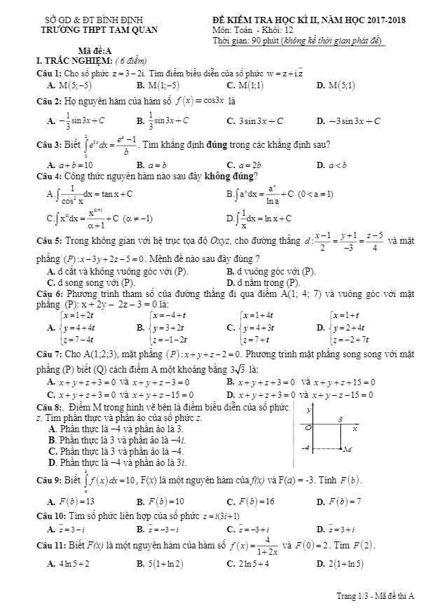 Đề thi Toán lớp 12 học kỳ 2 năm 2017 – 2018 trường Tam Quan – Bình Định không chỉ yêu cầu học sinh kiến thức vững chắc mà còn đánh giá khả năng áp dụng, giải quyết vấn đề của học sinh. Hãy cùng nhau học tập và rèn luyện để đạt kết quả cao trong kì thi này!
