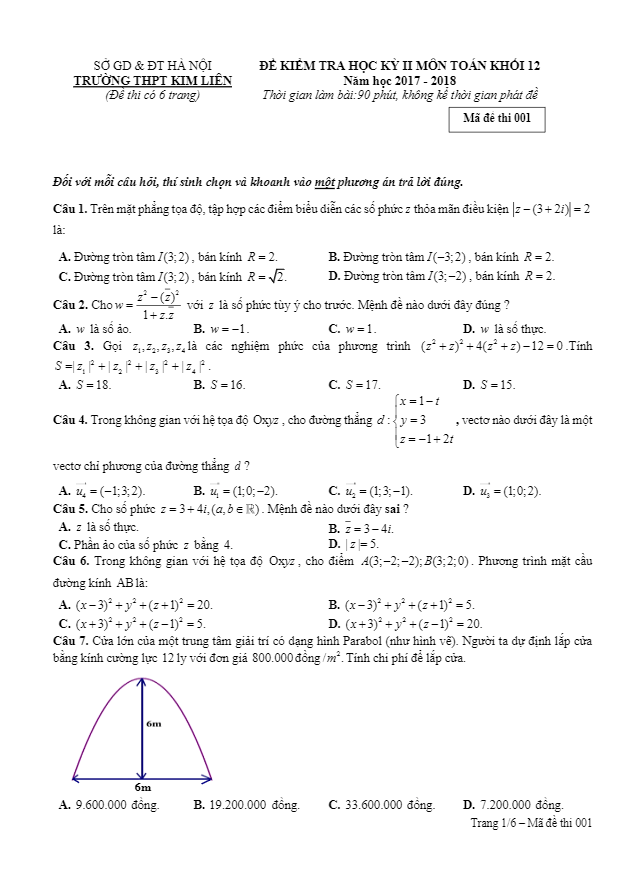 Đề kiểm tra học kì 2 Toán lớp 12 năm 2017 – 2018 trường THPT Kim Liên – Hà Nội