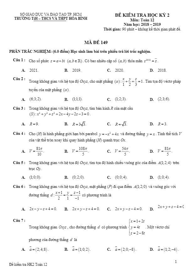 Vào ngày … tháng 05 năm 2019, trường TiH – THCS và THPT Hòa Bình, thành phố Hồ Chí Minh đã tổ chức kỳ thi kiểm tra học kỳ 2 môn Toán lớp 12 năm học 2018 – 2019. Đề kiểm tra này được mã hóa là 149 và được biên soạn theo hình thức trắc nghiệm kết hợp với câu hỏi tự luận.