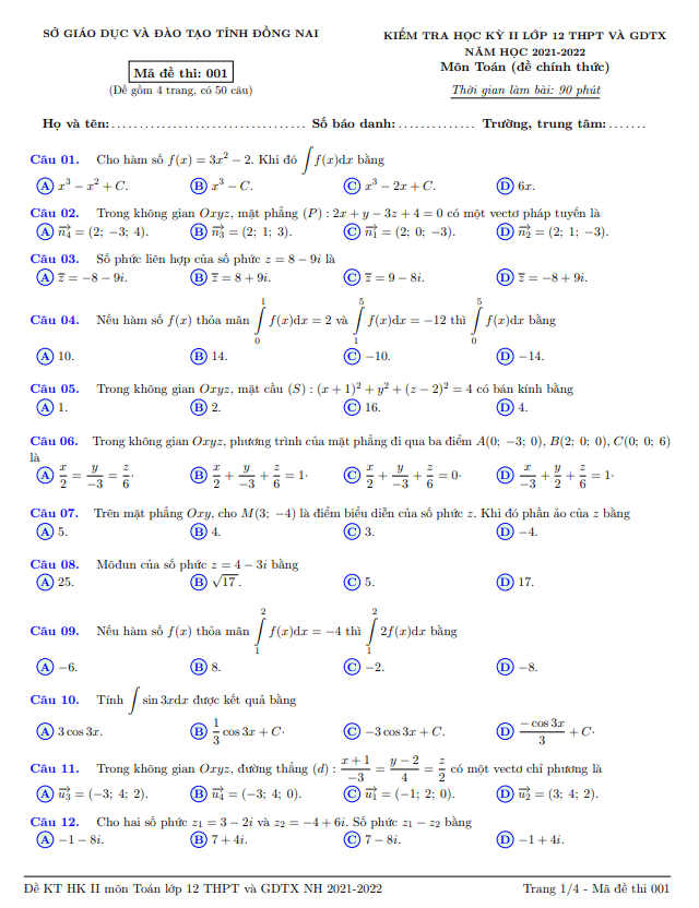 Chào quý thầy cô giáo và các em học sinh lớp 12, Sytu xin giới thiệu đến bạn đề kiểm tra cuối học kỳ 2 môn Toán lớp 12 THPT và GDTX năm học 2021 – 2022 của sở Giáo dục và Đào tạo tỉnh Đồng Nai. Đề thi mã đề 001 bao gồm 04 trang và 50 câu hỏi trắc nghiệm, thời gian làm bài 90 phút. Đề thi đi kèm đáp án và lời giải chi tiết.