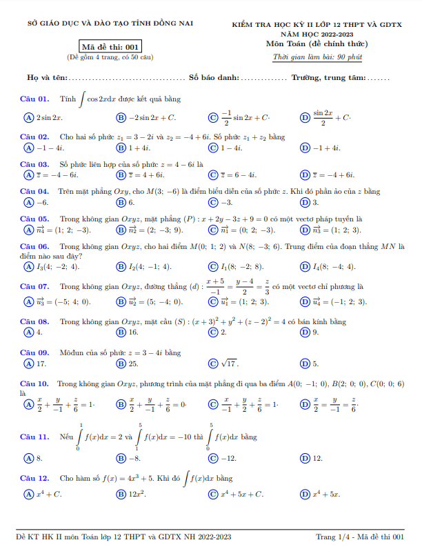 Chúng tôi xin gửi đến quý thầy cô và các em học sinh lớp 12 đề thi chính thức kiểm tra cuối học kỳ 2 môn Toán lớp 12 THPT và GDTX năm học 2022-2023 của sở Giáo dục và Đào tạo Đồng Nai. Đề thi sẽ có hình thức trắc nghiệm, bao gồm 50 câu trên 04 trang, thời gian làm bài 90 phút. Đề thi sẽ đi kèm đáp án và lời giải chi tiết với mã đề 001 và mã đề 002.