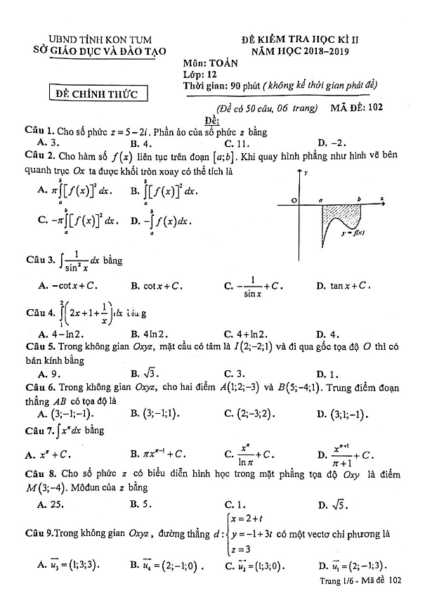 Đề kiểm tra học kì 2 môn Toán lớp 12 năm học 2018 – 2019 sở GD&ĐT Kon Tum đã được số hóa thành đề có mã 102, với 06 trang bao gồm 50 câu hỏi trắc nghiệm. Học sinh sẽ có 90 phút để hoàn thành bài thi. Đề thi bao gồm các mã đề 101, 102, 103, 104 để giúp học sinh tra cứu đáp án.
