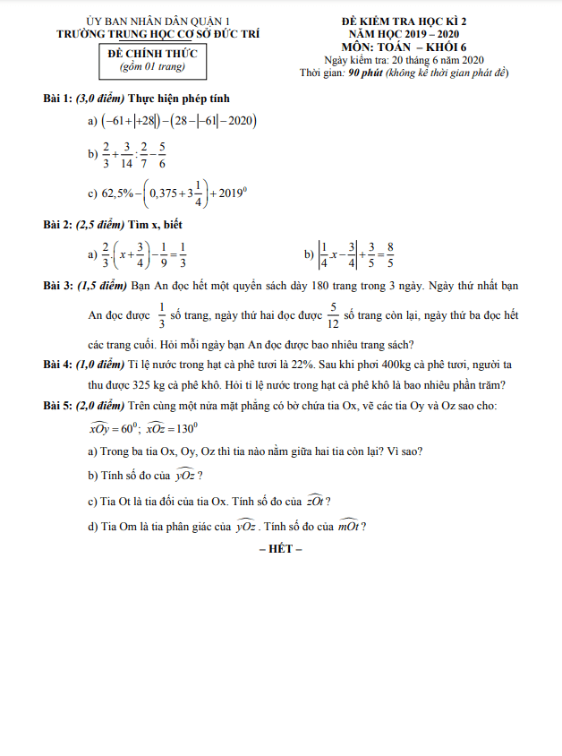 Trích dẫn đề kiểm tra học kỳ 2 Toán lớp 6 năm 2019 – 2020 trường THCS Đức Trí – TP HCM: