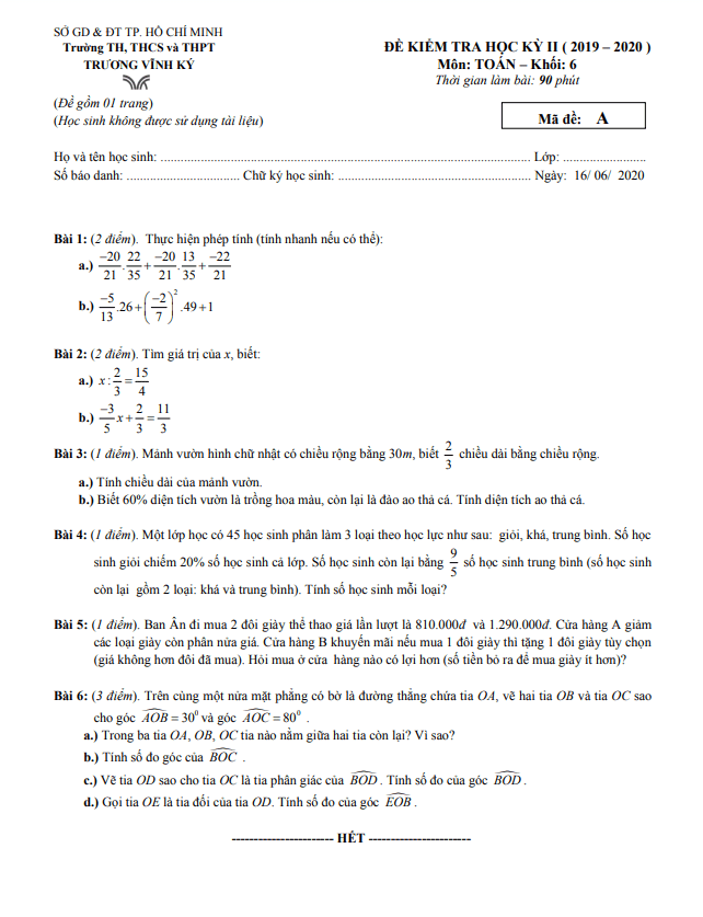 Đề kiểm tra học kì 2 (HK2) lớp 6 môn Toán năm 2019-2020 trường Trương Vĩnh Ký TP HCM