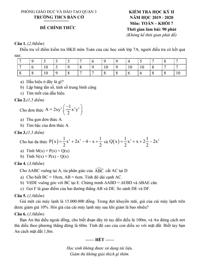 Đề kiểm tra học kỳ 2 môn Toán lớp 7 năm học 2019 – 2020 trường THCS Bàn Cờ, TP HCM