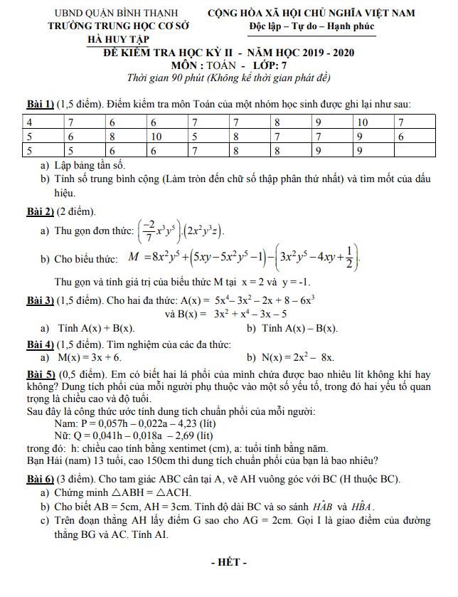 Đề kiểm tra học kỳ 2 Toán lớp 7 năm 2019 – 2020 trường THCS Hà Huy Tập TP HCM