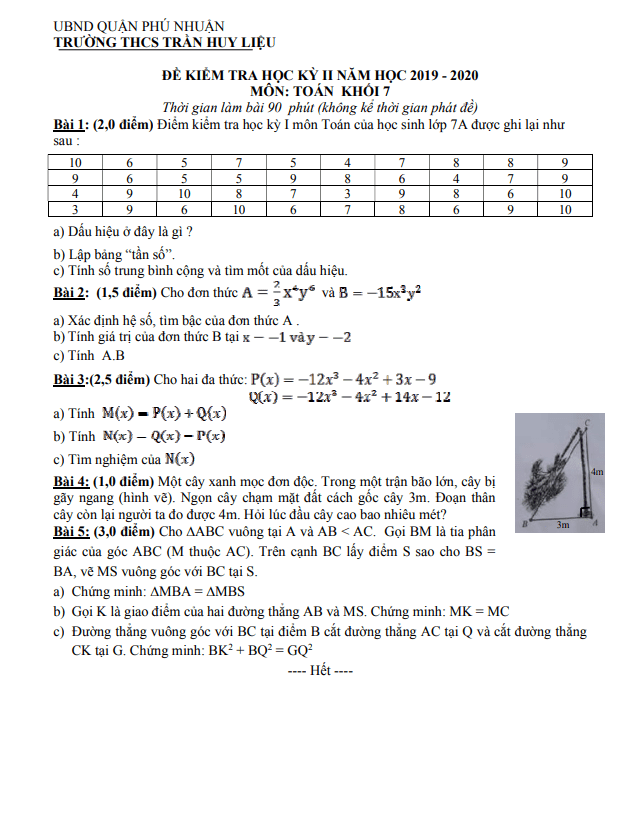 Đề kiểm tra học kỳ 2 môn Toán lớp 7 năm học 2019-2020 trường THCS Trần Huy Liệu TP HCM đã được Sytu giới thiệu đến quý thầy cô và các bạn học sinh lớp 7. Đề thi bao gồm các câu hỏi đa dạng, cung cấp đáp án và lời giải chi tiết, cũng như hướng dẫn chấm điểm.Một trong những câu hỏi trong đề kiểm tra là về việc phân tích dấu hiệu của điểm kiểm tra học kỳ I môn Toán của học sinh lớp 7A. Học sinh cần lập bảng tần số, tính số trung bình cộng và tìm mốt của dấu hiệu để hiểu rõ hơn về điểm số của mình.Câu hỏi khác trong đề thi liên quan đến đơn thức, yêu cầu học sinh xác định hệ số và bậc của đơn thức, tính giá trị của đơn thức tại một giá trị cụ thể, cũng như tính tích của hai đơn thức. Đây là cơ hội cho học sinh thực hành và nắm vững kiến thức về đơn thức trong Toán lớp 7.Ngoài ra, đề thi còn đưa ra một bài toán thực tế về việc tính toán chiều cao ban đầu của một cây xanh bị gãy trong trận bão. Bài toán này giúp học sinh kết hợp kiến thức Toán và hiểu biết về thực tế để giải quyết vấn đề.Tóm lại, đề kiểm tra học kỳ 2 môn Toán lớp 7 năm học 2019-2020 trường THCS Trần Huy Liệu TP HCM mang đến cơ hội cho học sinh thử thách bản thân, áp dụng kiến thức vào các bài toán thực tế, và phát triển kỹ năng giải quyết vấn đề. Đây là một cơ hội tuyệt vời để học sinh rèn luyện và nâng cao kiến thức Toán của mình.