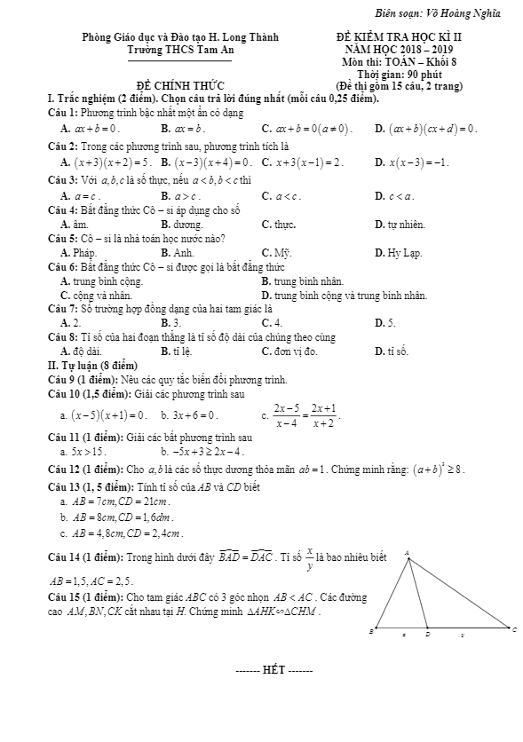Để đánh giá chất lượng học tập môn Toán của học sinh lớp 8 trong giai đoạn học kỳ 2 năm học 2018 – 2019, trường THCS Tam An, Long Thành, Đồng Nai đã tổ chức kỳ thi kiểm tra học kỳ 2 Toán lớp 8. Điểm số của kỳ thi sẽ được tính theo hệ số 3 và được sử dụng để xếp loại học lực Toán lớp 8.