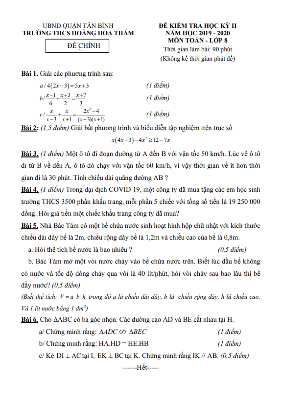 Sáng ngày hôm nay, Sytu xin gửi đến quý thầy, cô giáo và các em học sinh đề kiểm tra học kì 2 môn Toán lớp 8 năm học 2019-2020 của trường THCS Hoàng Hoa Thám, quận Tân Bình, thành phố Hồ Chí Minh. Đề kiểm tra bao gồm các câu hỏi, đều được đi kèm đáp án cùng lời giải chi tiết và hướng dẫn chấm điểm. Điều đó sẽ giúp các em tự ôn tập và kiểm tra kiến thức của mình.Một trong những câu hỏi trong đề kiểm tra là: “Một ô tô đi đoạn đường từ A đến B với vận tốc 50 km/h. Lúc về ô tô đi từ B về đến A, ô tô đó chạy với vận tốc 60 km/h, vì vậy thời gian về ít hơn thời gian đi là 30 phút. Hãy tính chiều dài quãng đường AB?”Câu hỏi thứ hai trong đề kiểm tra là: “Trong đại dịch COVID-19, một công ty đã mua tặng các em học sinh trường THCS 3500 phần khẩu trang, mỗi phần 5 chiếc với tổng số tiền là 19,250,000 đồng. Hỏi giá tiền một chiếc khẩu trang công ty đã mua?”Câu hỏi cuối cùng trong đề kiểm tra là: “Nhà Bác Tám có một bể chứa nước sinh hoạt hình hộp chữ nhật với kích thước chiều dài đáy bể là 2m, chiều rộng đáy bể là 1,2m và chiều cao của bể là 0,8m. Hỏi thể tích bể nước là bao nhiêu? Bác Tám mở một vòi nước chảy vào bể chứa nước trên. Biết lúc đầu bể không có nước và tốc độ dòng chảy qua vòi là 40 lít/phút, hỏi vòi chảy sau bao lâu thì bể đầy nước? (Biết thể tích: V = a * b * h trong đó a là chiều dài đáy, b là chiều rộng đáy, h là chiều cao. Và 1 lít nước bằng 1 dm3).”Hy vọng rằng các em sẽ làm tốt và đạt kết quả cao trong đề kiểm tra này. Để tải file WORD (dành cho quý thầy, cô) và có truy cập đến đề kiểm tra chi tiết, quý thầy, cô và các em vui lòng truy cập vào liên kết sau: [đính kèm liên kết].Chúc các em ôn tập tốt và đạt thành tích xuất sắc trong kì thi này!