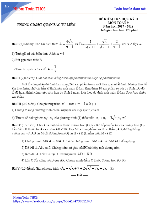 Đề kiểm tra HK2 Toán lớp 9 năm 2017 – 2018 phòng GD và ĐT Bắc Từ Liêm – Hà Nội
