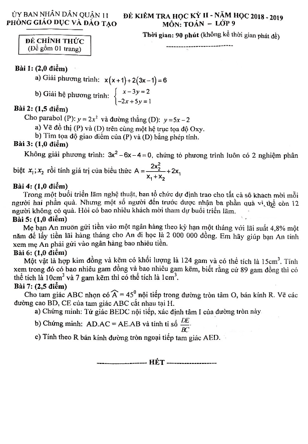 Đề kiểm tra học kì 2 (HK2) lớp 9 môn Toán năm 2018 2019 phòng GD ĐT Quận 11 TP HCM