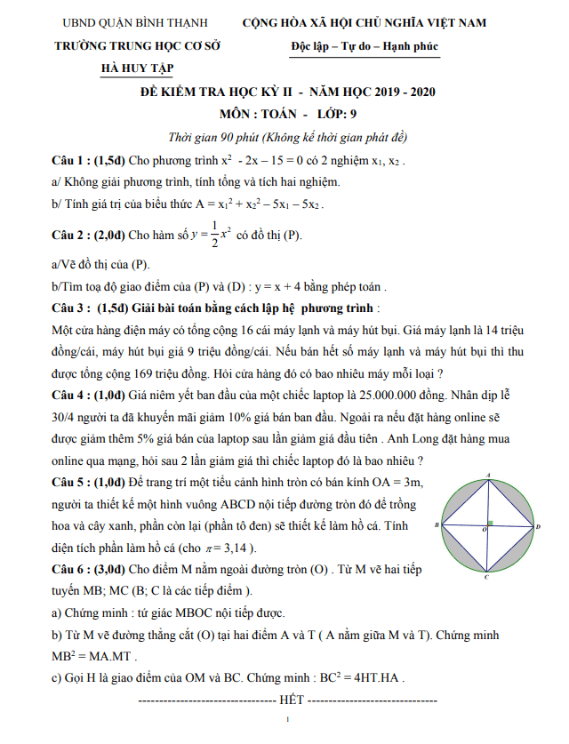 Đề kiểm tra học kì 2 (HK2) lớp 9 môn Toán năm 2019 2020 trường THCS Hà Huy Tập TP HCM