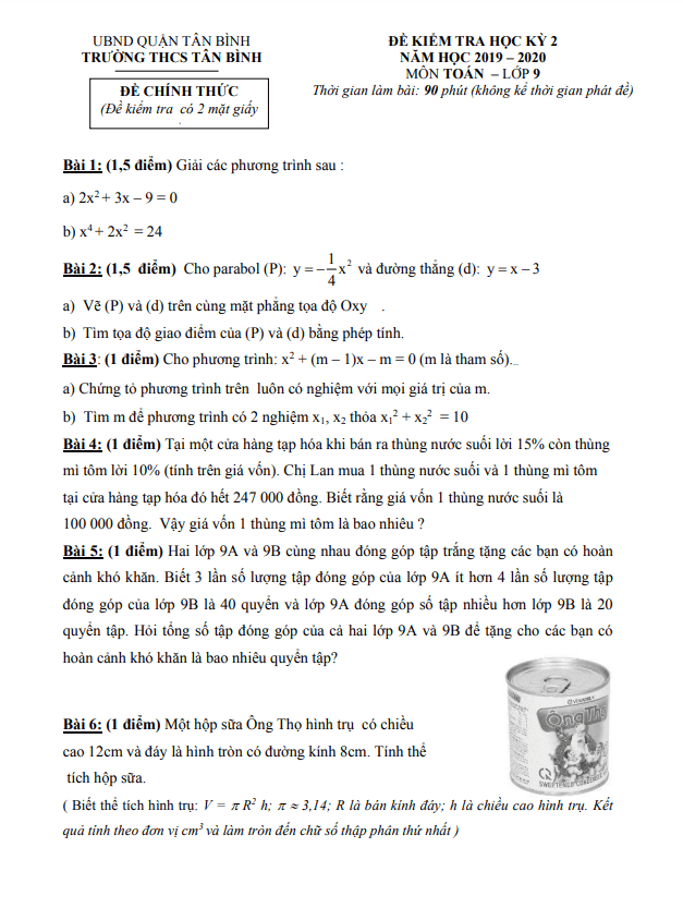 Chúng ta hãy cùng xem qua đề kiểm tra học kỳ 2 môn Toán lớp 9 năm học 2019 – 2020 tại trường THCS Tân Bình, quận Tân Bình, thành phố Hồ Chí Minh. Bài kiểm tra bao gồm các câu hỏi sau: