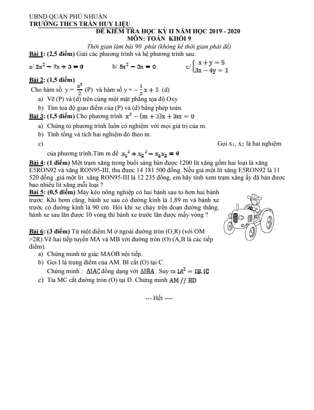 Trích dẫn một số câu hỏi từ đề kiểm tra học kỳ 2 Toán lớp 9 năm 2019 – 2020 trường THCS Trần Huy Liệu – TP HCM:
