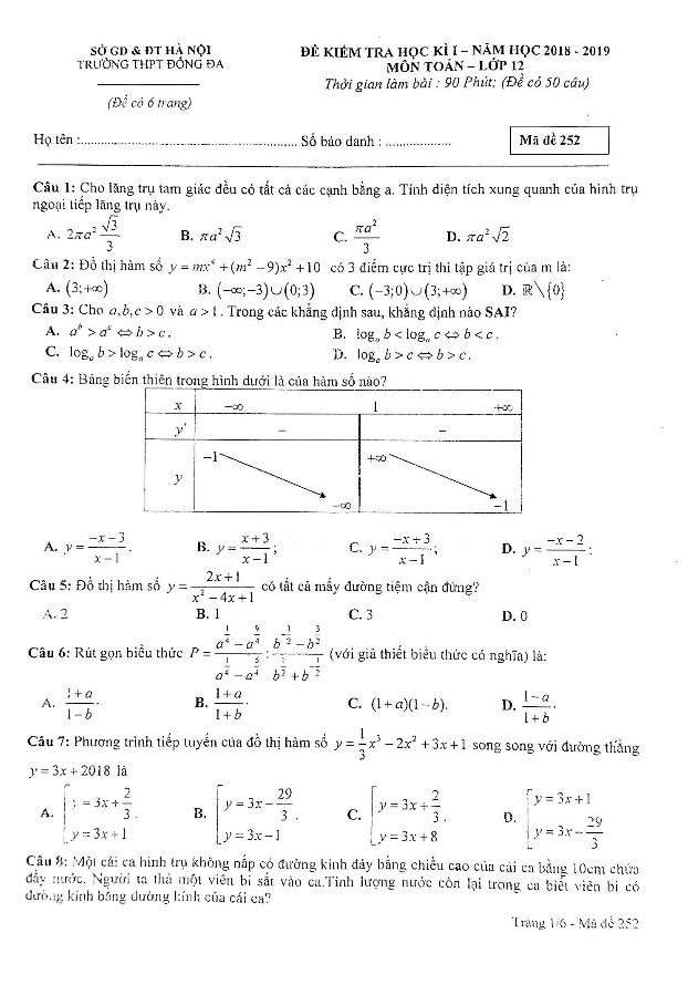 Đề kiểm tra học kỳ I lớp 12 môn Toán năm học 2018-2019 trường THPT Đống Đa Hà Nội là một trong những bước quan trọng trong quá trình học tập của học sinh. Đề thi được xây dựng dựa trên chương trình học, giúp học sinh củng cố kiến thức và nâng cao kỹ năng làm bài thi.