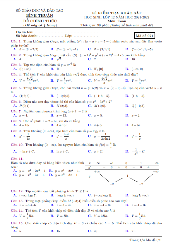 Xin chào quý thầy cô và các em học sinh lớp 12! Sytu xin giới thiệu đến các bạn đề kiểm tra khảo sát môn Toán lớp 12 năm học 2021-2022 sở Giáo dục và Đào tạo tỉnh Bình Thuận (mã đề 021). Đề kiểm tra này được thiết kế nhằm giúp các em rèn luyện kỹ năng và chuẩn bị cho kỳ thi tốt nghiệp THPT 2022 môn Toán do Bộ Giáo dục và Đào tạo tổ chức.