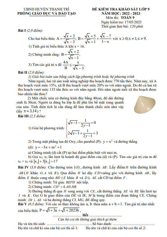 Sytu xin chào quý thầy cô và các em học sinh lớp 9! Hôm nay chúng ta sẽ cùng khám phá đề kiểm tra khảo sát môn Toán lớp 9 năm học 2022-2023 từ Phòng Giáo dục và Đào tạo Thanh Trì, Hà Nội. Bài kiểm tra sẽ diễn ra vào ngày 17/5/2023 và sẽ được cung cấp đáp án, lời giải chi tiết và hướng dẫn chấm điểm.