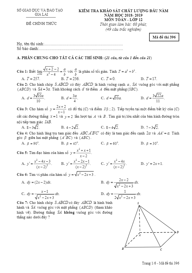 Đề kiểm tra KSCL đầu năm 2018 – 2019 Toán lớp 12 sở GD và ĐT Gia Lai mã đề 396 được biên soạn theo hình thức trắc nghiệm khách quan. Thời gian làm bài là 60 phút, đề gồm 2 phần: phần chung dành cho tất cả các thí sinh gồm 21 câu, phần riêng dành cho hệ GDTX và hệ GDPT, mỗi phần gồm 14 câu. Đề bao gồm kiến thức từ chương trình Toán lớp 11 và Toán lớp 12.
