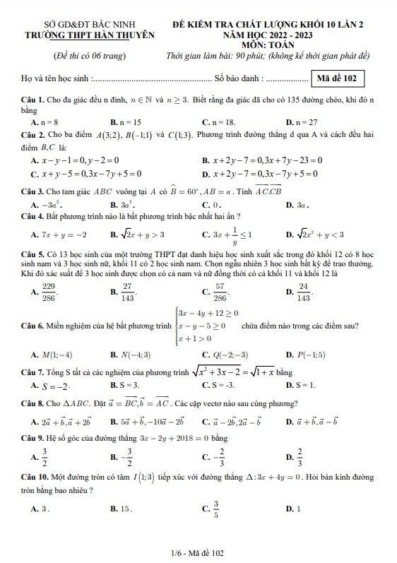 Xin chào quý thầy cô và các em học sinh lớp 10! Đây là bộ đề kiểm tra chất lượng môn Toán khối 10 lần 2 năm học 2022 – 2023 của trường THPT Hàn Thuyên, tỉnh Bắc Ninh. Đề thi mã đề 102 bao gồm 50 câu trắc nghiệm trên 06 trang, với thời gian làm bài 90 phút (không tính thời gian phát đề). Bạn có thể tải đáp án mã đề 102 213 324 435 546 657 768 879 để kiểm tra kết quả sau khi hoàn thành bài thi.