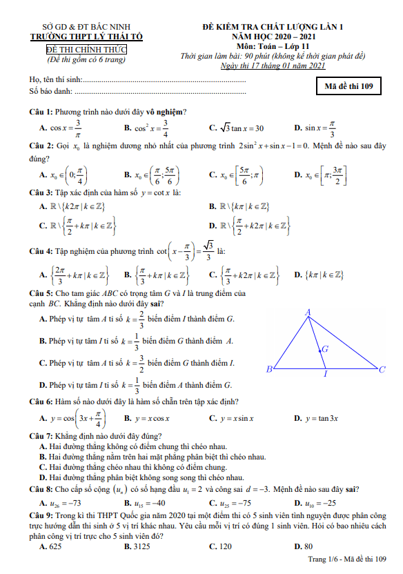 Đề kiểm tra chất lượng Toán lớp 11 lần 1 năm học 2020 – 2021 trường THPT Lý Thái Tổ – Bắc Ninh đã được tổ chức với nội dung bao gồm 50 câu trắc nghiệm trên 06 trang giấy. Thời gian làm bài cho học sinh là 90 phút, và kỳ thi đã diễn ra vào Chủ Nhật ngày 17 tháng 01 năm 2021.