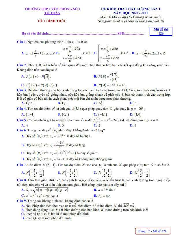 Đề kiểm tra lớp 11 môn Toán lần 1 năm học 2020-2021 của trường THPT Yên Phong số 1, Bắc Ninh là một bộ đề thi chất lượng được biên soạn theo hình thức trắc nghiệm với 50 câu hỏi và bài toán. Thời gian làm bài là 90 phút, đảm bảo thử thách và kiểm tra kiến thức của học sinh.Một trong những bài toán trong đề thi đề cập đến việc mua rau cải và thịt lợn. Cụ thể, câu hỏi đưa ra tình huống mua sắm của Chị Hạnh và Anh Phúc, yêu cầu tính toán giá một cân thịt lợn dựa trên thông tin về giá bán của rau cải và thịt lợn. Đây là một bài toán áp dụng kiến thức về phép toán và giải phương trình.Bên cạnh đó, đề thi cũng đặt ra bài toán về xác suất và hình học. Học sinh được yêu cầu tính xác suất để khi bỏ ra 9 que diêm từ 6 điểm, luôn có một đường đi bằng diêm từ một điểm đến điểm khác. Đây là một bài toán yêu cầu kỹ năng tư duy logic và xác suất.Ngoài ra, đề thi cũng đưa ra một bài toán về thống kê số lượng người tử vong trong đại dịch Covid-19. Học sinh cần tính tổng số người tử vong trên toàn thế giới từ tháng 1 đến tháng 12 năm 2020 dựa trên thông tin cho trước. Đây là một bài toán kết hợp kiến thức toán học và thực tế.Trong đề kiểm tra Toán lớp 11 lần 1 năm học 2020-2021 của trường Yên Phong 1, Bắc Ninh không chỉ đánh giá kiến thức Toán của học sinh mà còn khuyến khích họ áp dụng kiến thức vào thực tế, phát triển kỹ năng tư duy và giải quyết vấn đề. Đây là một bộ đề thi mang tính chất xây dựng kiến thức và phát triển năng lực cho học sinh lớp 11.
