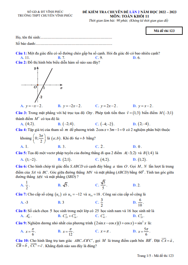 Đề kiểm tra lớp 11 môn Toán lần 2 năm 2022-2023 trường THPT chuyên Vĩnh Phúc