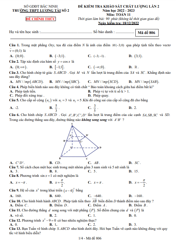 Đề kiểm tra lớp 11 môn Toán lần 2 năm 2022 2023 trường THPT Lương Tài 2 Bắc Ninh
