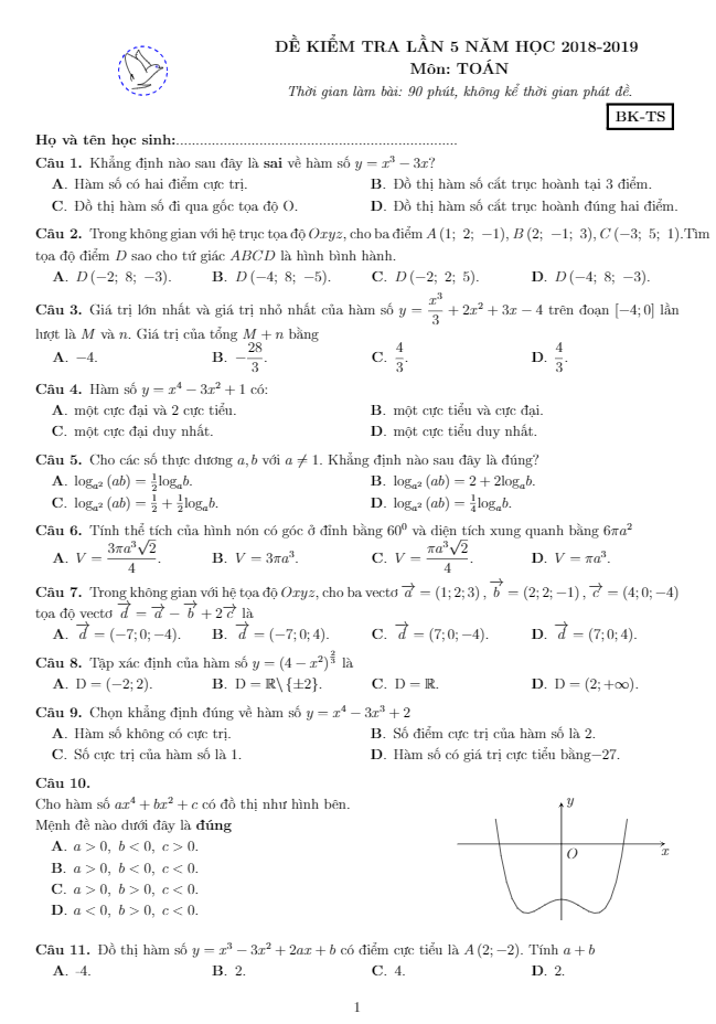 Đề kiểm tra Toán lớp 12 năm 2018 – 2019 trường THCS và THPT Nguyễn Khuyến – Bình Dương lần 5